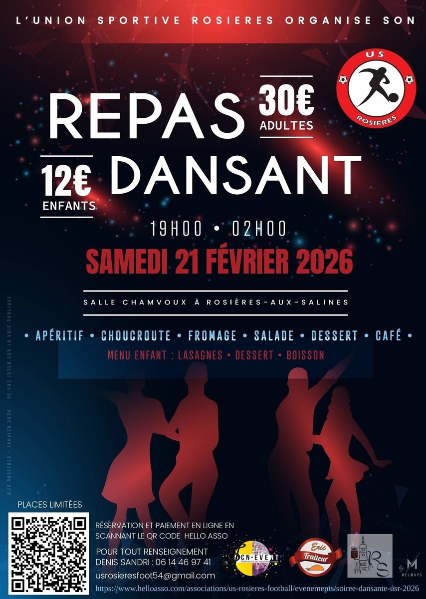 đČ RĂ©servation et paiement en ligne via HelloAsso (QR code sur lâaffiche et en image jointe) ou via le lien direct : https://www.helloasso.com/associations/us-rosieres-football/evenements/soiree-dansante-usr-2026